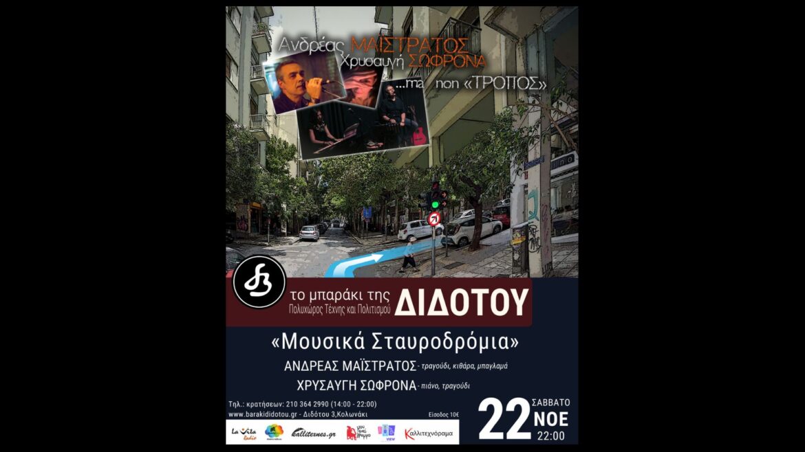 Ανδρέας Μαϊστράτος & Χρυσαυγή Σωφρονά ...ma non «Τρόπος» στο Μπαράκι της Διδότου«Μουσικά Σταυροδρόμια»Σάββατο 22 Νοεμβρίου 2025Οι «ma non Τρόπος», ακολουθώντας πολλές και διαφορετικές μουσικές διαδρομές, θα σταθούν σε ξεχωριστά «Μουσικά Σταυροδρόμια».Ένας τραγουδιστής με ιδιαίτερη έκταση και εκφραστικές δυνατότητες, πιάνο με ευαίσθητες χρωματικές υπογραμμίσεις και έγχορδα, που εναλλάσσονται, σε τραγούδια-συγκάτοικους μέσα απ’ το ηχόχρωμα των «Τρόπος», αλλά και κάποια επιλεγμένα δικά τους και φίλων:Λίθοπες (Στίχοι/Μουσική: Νίκος Σκορίνης – Ανδρέας Μαϊστράτος)Ταξίδια που δεν […]