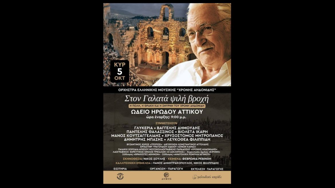 «Στον Γαλατά ψιλή βροχή»Η ΠΟΛΗ, Η ΘΡΑΚΗ ΚΑΙ Η ΣΜΥΡΝΗΤΟΥ ΧΡΟΝΗ ΑΗΔΟΝΙΔΗΩδείο Ηρώδου του ΑττικούΚυριακή 5 Οκτωβρίου 2025Eνα μεγάλο αφιέρωμα στον σπουδαίο Χρόνη Αηδονίδη θα παρουσιαστεί την Κυριακή 5 Οκτωβρίου στο Ηρώδειο από την Α.Μ.Κ.Ε. «Κέντρο Έρευνας, Τεχνών & Πολιτισμού ΔΟΜΟΣ». Είναι μια μεγάλη μουσική βραδιά-γιορτή αφιερωμένη στη μνήμη του αυθεντικού ερμηνευτή της παράδοσης, που με τη φωνή του ένωσε τη Θράκη με την Πόλη και όλη τη Μικρασία.Η συναυλία με […]